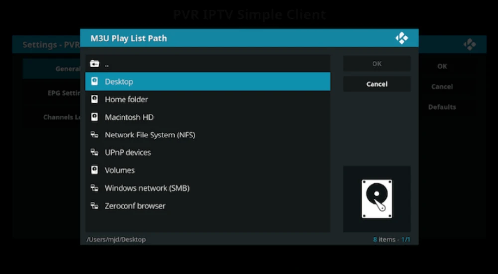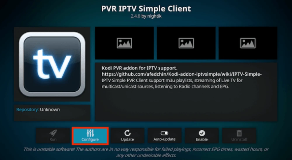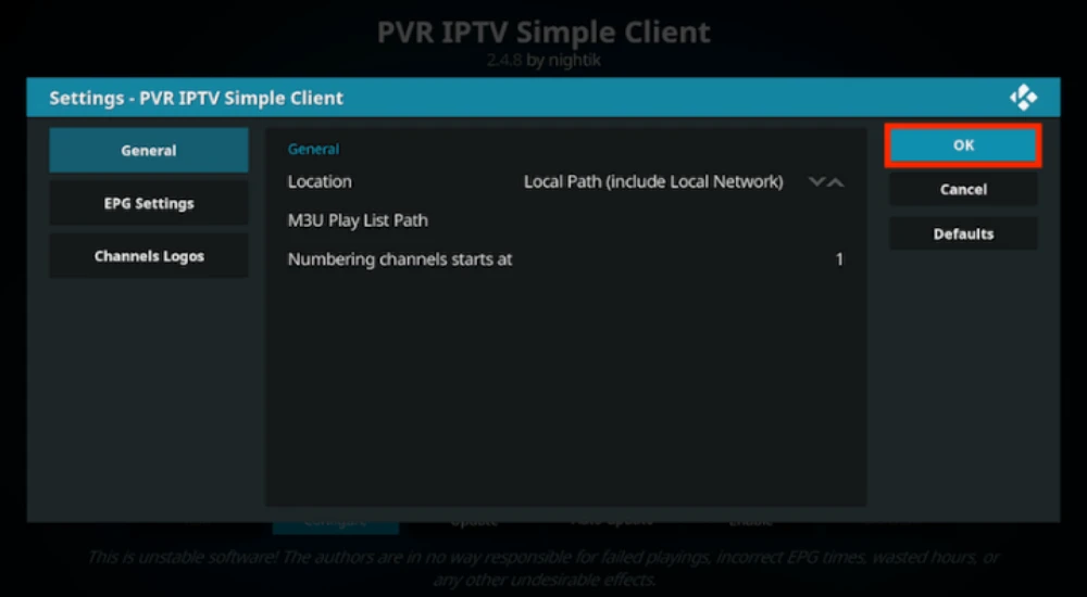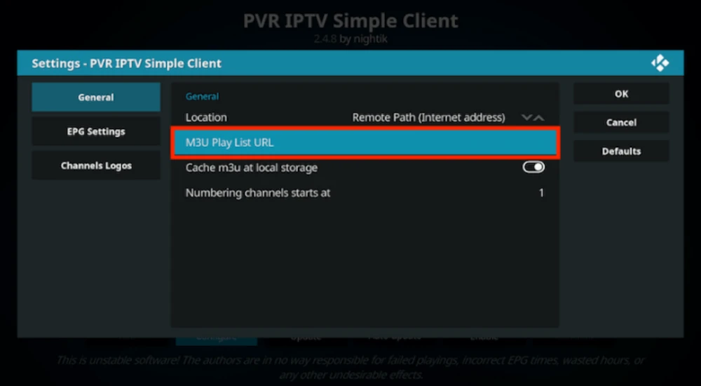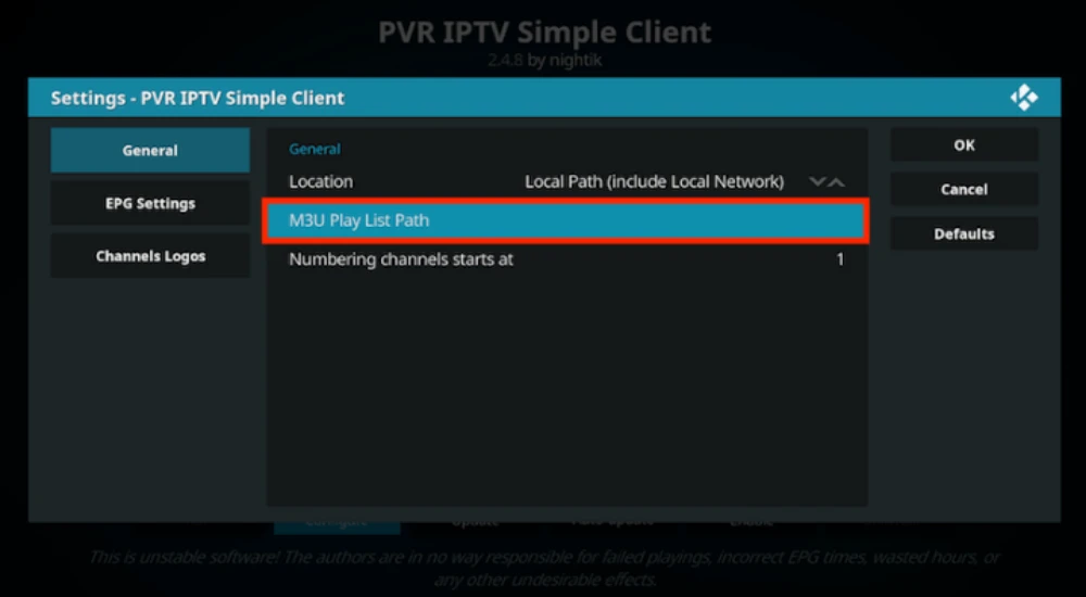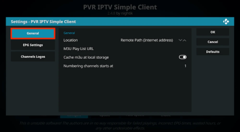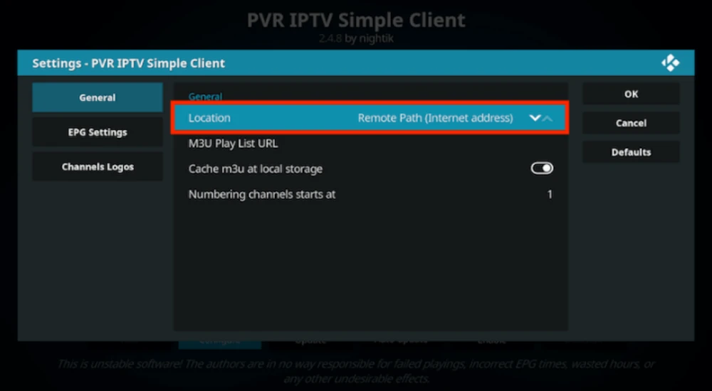 Click on it and select “Configure”. This opens up the configuration screen where you’ll input all your IPTV details. Under the General tab, you’ll see a field labeled “Location”. Set this to “Remote path” if you’re using an online M3U playlist (which most people are).